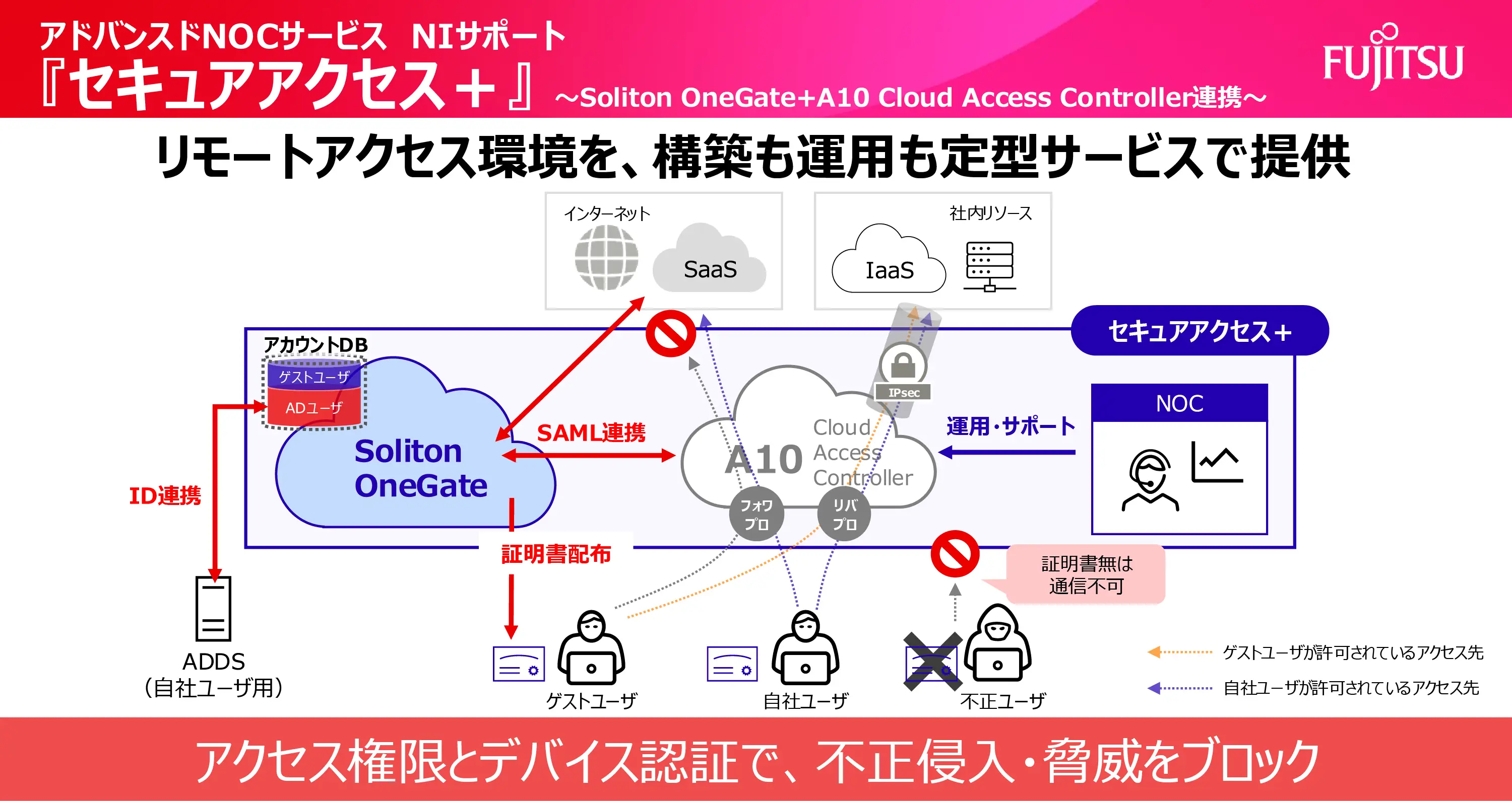 セキュアアクセス+は、ユーザーやアプリケーションの全アクセスを厳しく管理することで、利用者はどこからでも安心・安全にアクセスできる環境を実現します。セキュリティ面は、Soliton OneGateとA10 Cloud Access Controllerを組み合わせて構成されており、両製品の連携によって強固な認証を備えたゲートウェイとして、セキュアアクセス+で機能しています。