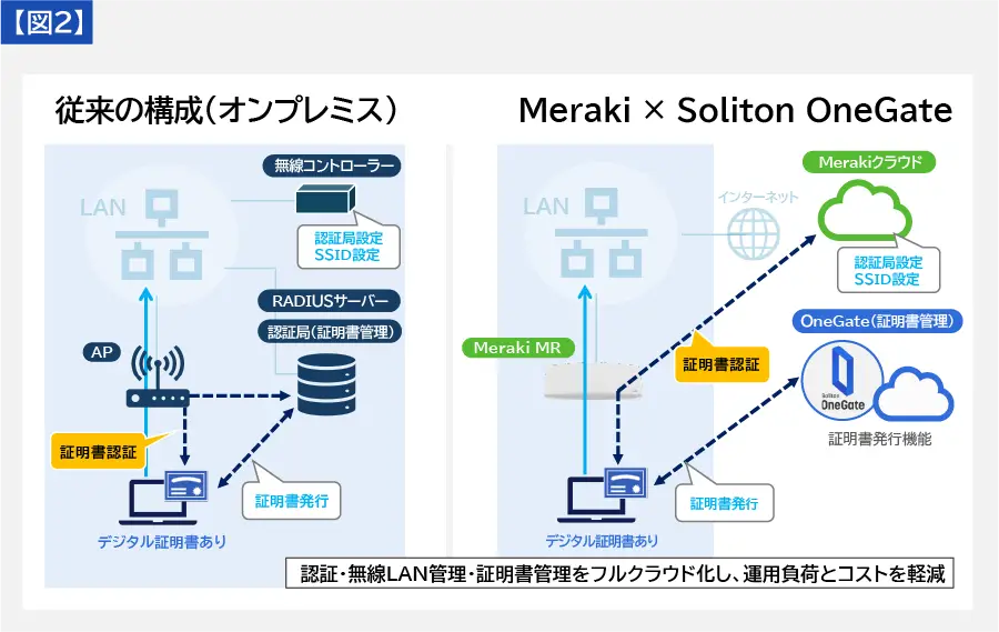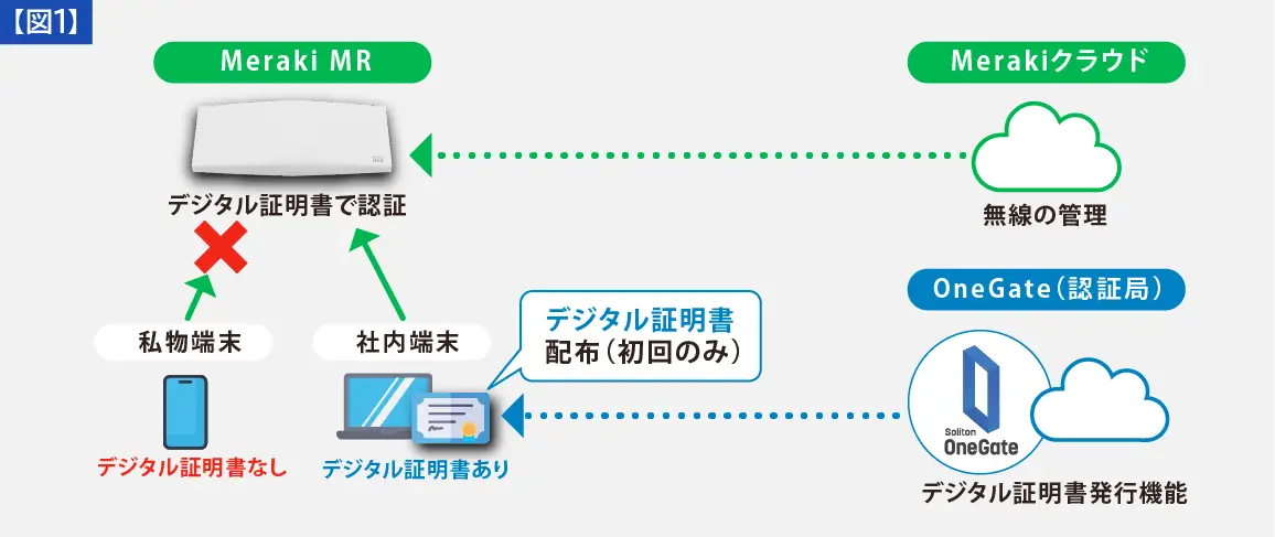 Cisco MerakiとSoliton OneGateを連携させることで、運用性に優れたセキュアな証明書認証による無線LAN環境を構築できます。