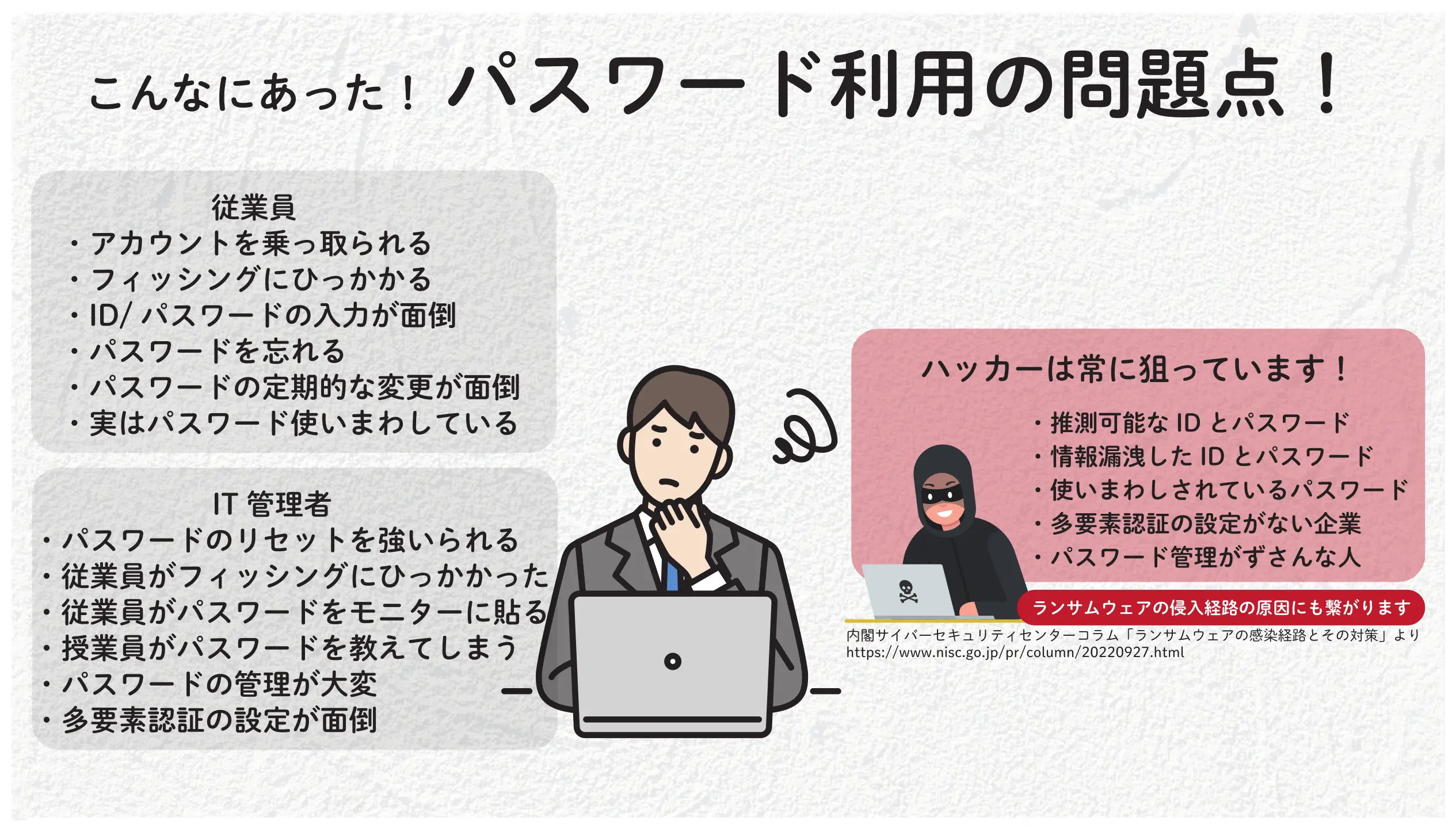 そもそも、IDとパスワードの組み合わせによる認証方式そのものに、構造的な脆弱性があるのです。利便性とセキュリティの両面から見ても、パスワードによる防御はもはや限界なのです。