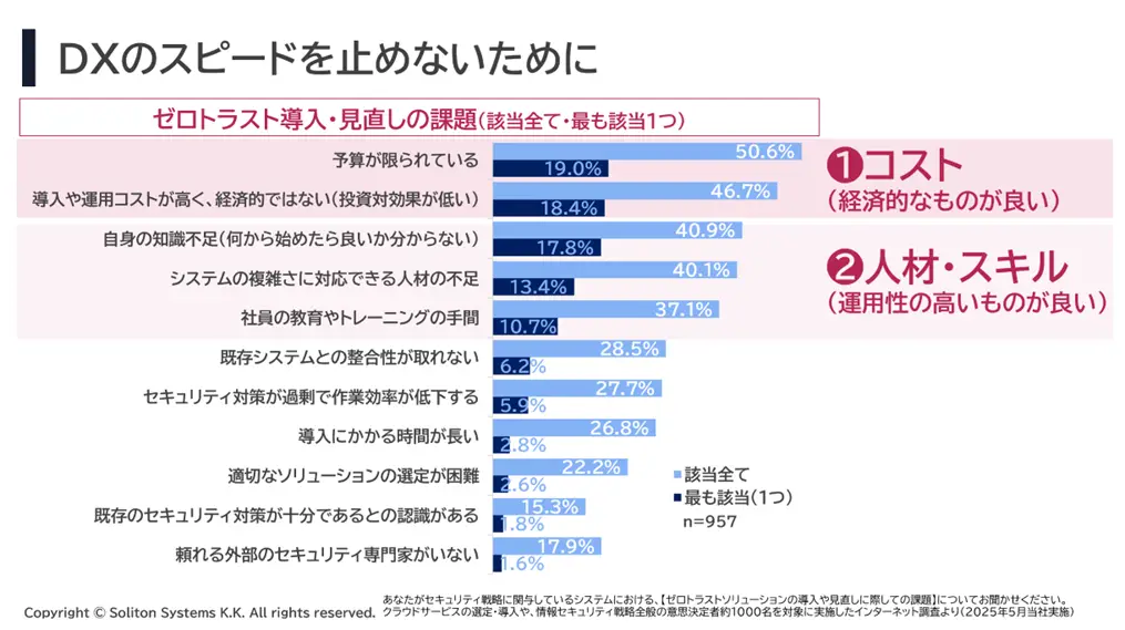 セキュリティを確保するうえで MFA の導入や適切なユーザー管理は欠かせませんが、現実のビジネス環境ではそれだけでは十分とは言えません。セッションで紹介された調査データは、IT リーダーが直面する厳しい現実を浮き彫りにしています。ゼロトラスト導入における最大の障壁は経済性(コスト)であり、さらに深刻化する IT 人材不足の中では、運用性(人材・スキル)の面でも扱いやすいシンプルなツールが求められています。