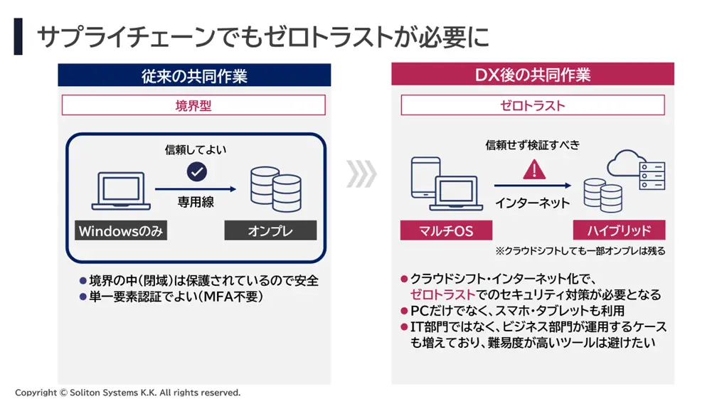 ゼロトラストの核心は、アクセスしてくるのが「正しいユーザー」であるかどうかを確実に確認するプロセスにあります。自社の従業員の ID 管理は比較的取り組みやすい一方で、サプライチェーンのように、管理下にない外部組織のユーザーが多数関わる環境では、その管理・検証が急速に複雑になります。荒木が「最大の壁」と指摘したとおり、この外部ユーザー管理こそが、サプライチェーンにおけるゼロトラスト実現を阻む最大の難関となっています。
