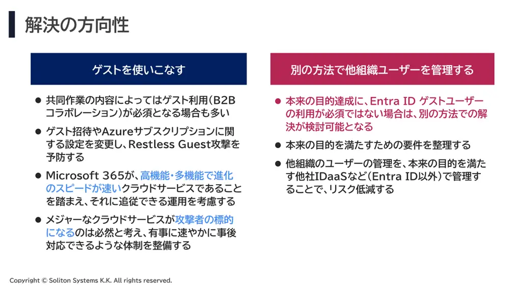 このアプローチは、Entra ID のゲスト機能を利用し続けながら、そのリスクを適切に管理・抑制していく方法です。たとえば、ゲスト招待ポリシーを見直して権限を持つ管理者のみが招待できるように制限したり、Azure サブスクリプションの管理権限をより厳格に設定するなどの対策が求められます。ただし、Microsoft 365 のように進化の速いクラウドサービスを安全に活用するには、継続的な情報収集や設定の見直し、有事に対応できる運用体制の整備が欠かせません。
