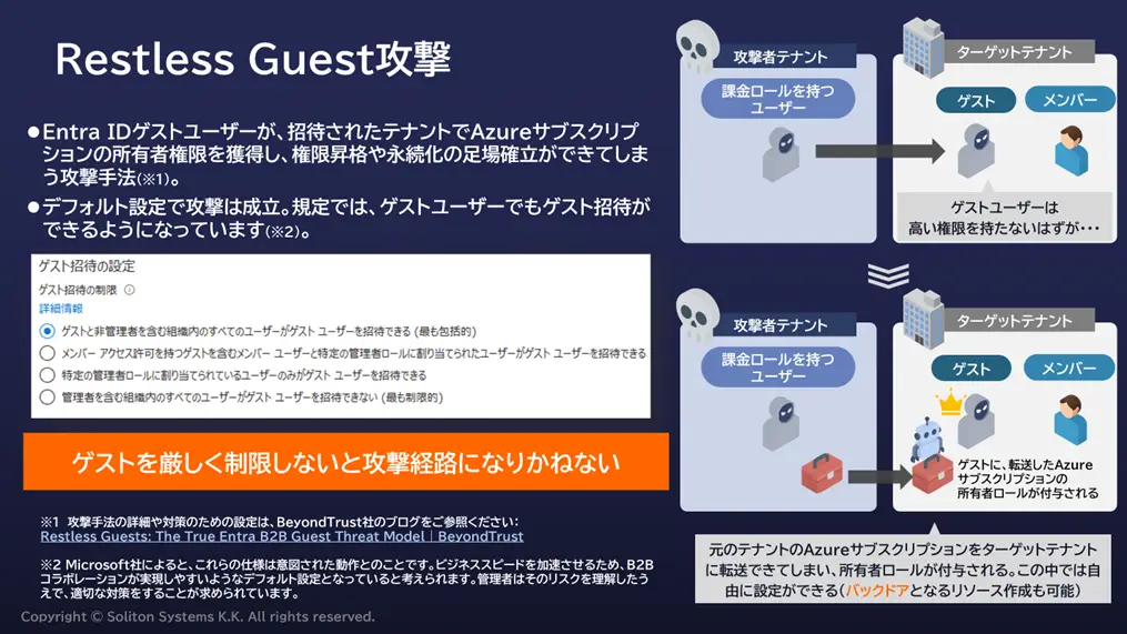 本セッションが伝えた最も重要なメッセージは、DX の進展やサプライチェーン連携の拡大に伴い、外部ユーザー管理がセキュリティの中心的な課題になりつつあるという現実です。「Restless Guest」攻撃の例が示すように、便利さや無料であることだけを理由にツールを選択すると、デフォルト設定に潜むリスクを見落としてしまう危険性があります。一つのツールですべてを解決できるという前提を見直す時期にきているのかもしれません。