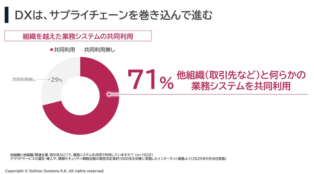当社が2025年5月に実施した調査でも、71%の組織が「外部組織と業務システムを共同利用している」と回答しており、サプライチェーン全体での連携が一般化している状況が明らかになりました。一方で、多様な組織のユーザーや端末が混在する環境を安全に維持することは容易ではなく、多くの企業が対応に苦慮しています。