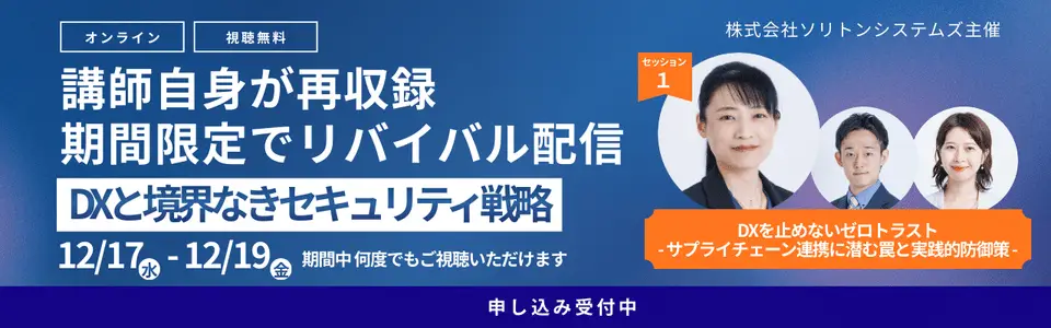 先日開催された「Security Days Fall 2025」において、株式会社ソリトンシステムズのエバンジェリスト 荒木粧子が「DXを止めないゼロトラスト – サプライチェーン連携に潜む罠と実践的防御策 」と題した講演をおこないました。