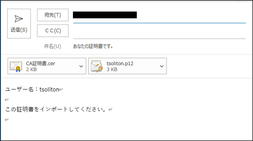 ※今回はメールで送付していますが、PKCS#12ファイルを利用者へ配布する運用はセキュリティリスクを伴います。