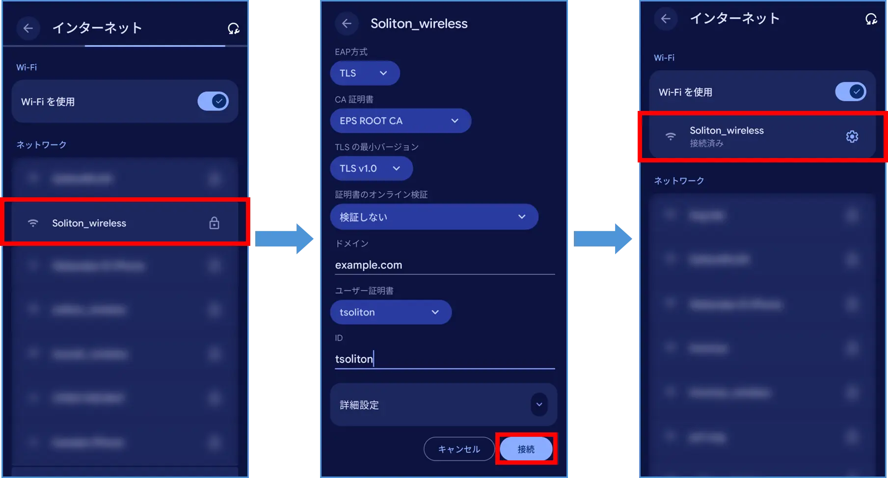 今回はSSID:「Soliton_wireless」を使用します。