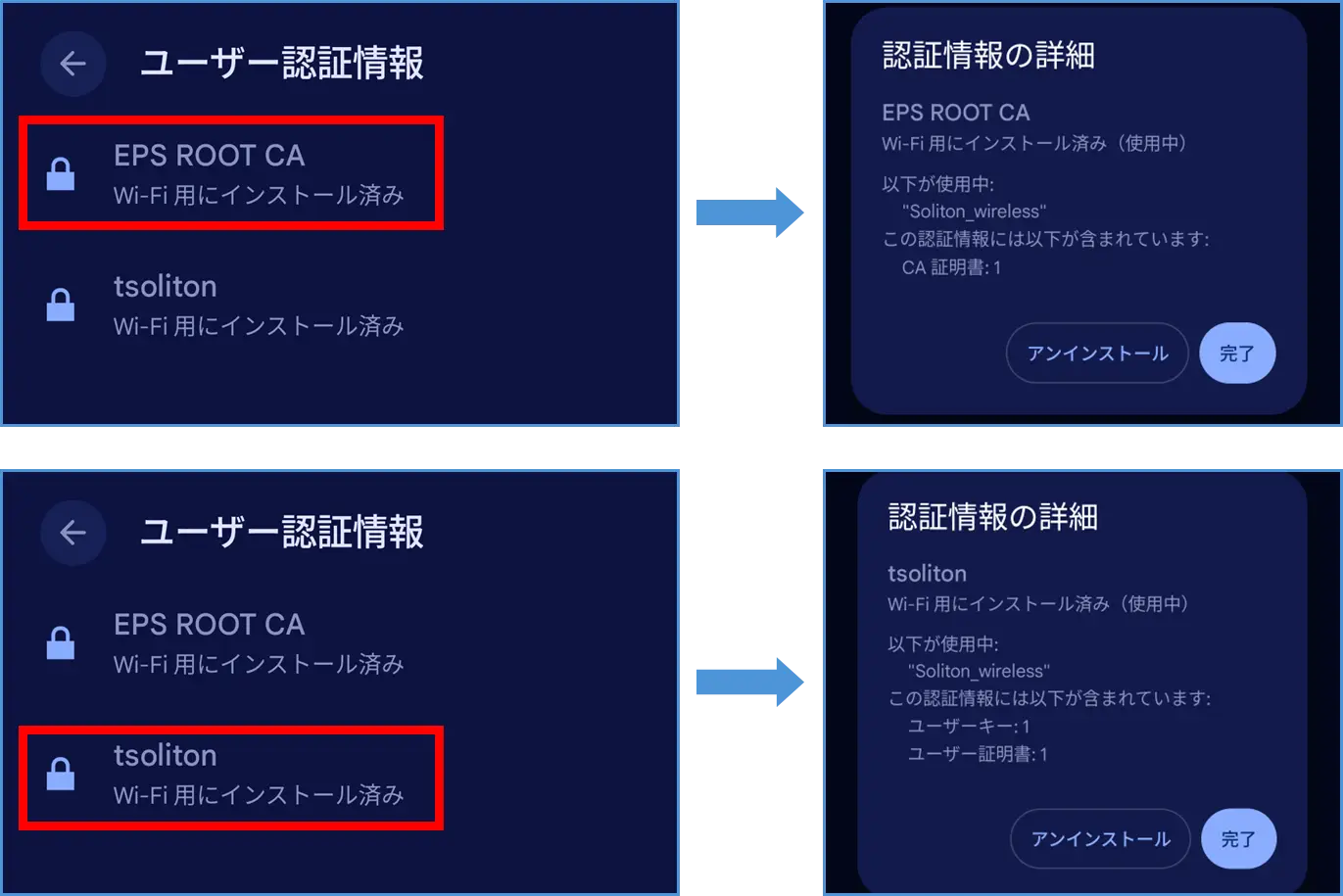 Android端末へインポートしたCA証明書とクライアント証明書を確認する方法をご紹介します。