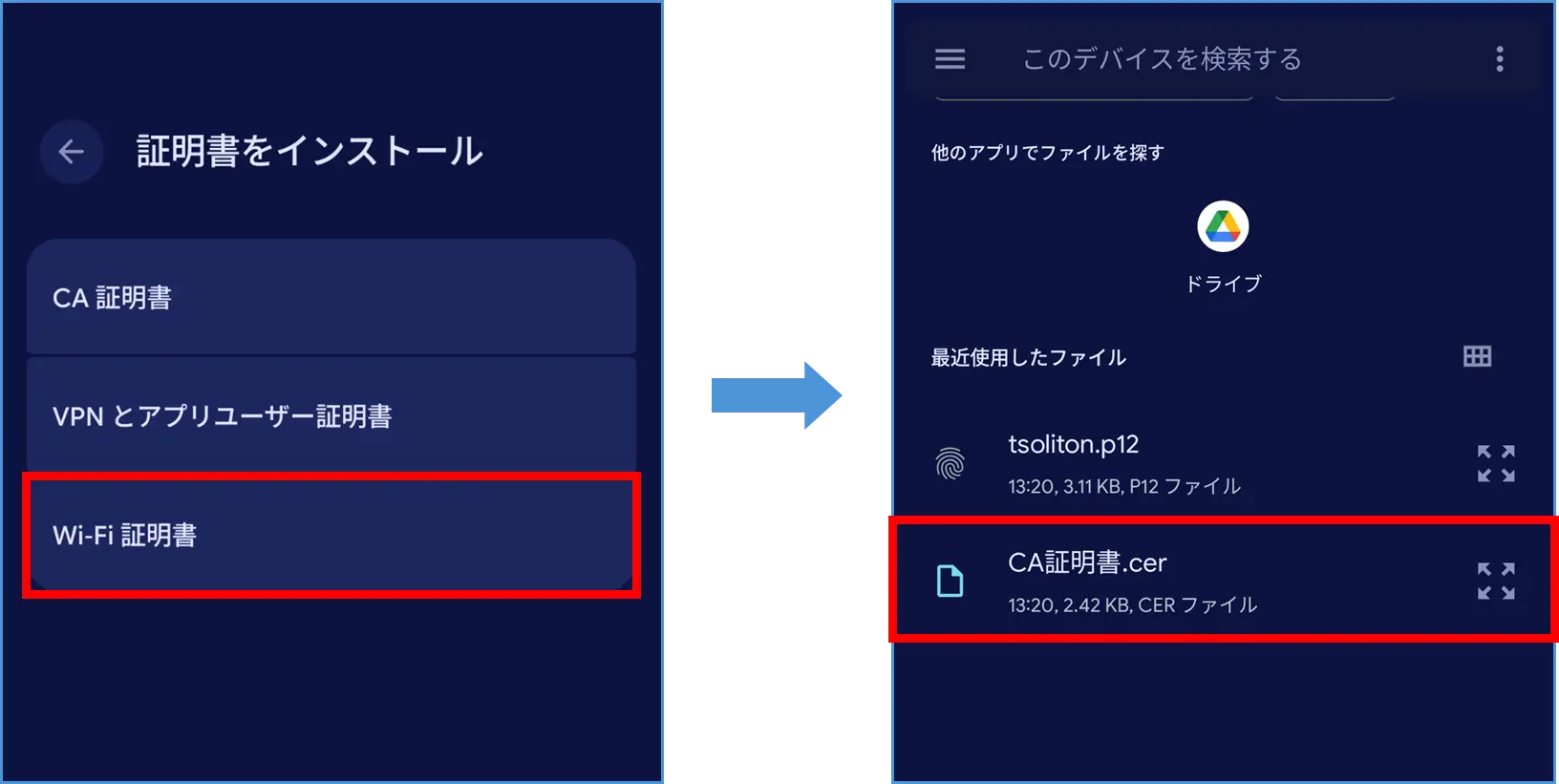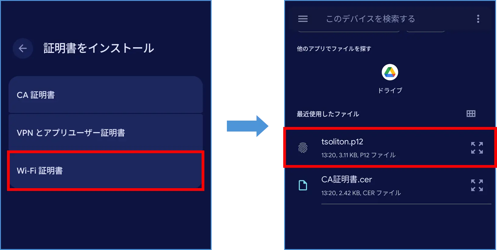 NetAttest EPSで発行したPKCS#12ファイルとCA証明書をAndroid端末へインポートします。