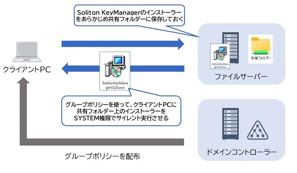 Active Directoryのグループポリシーにおけるスタートアップスクリプトを利用することで、管理者権限がない環境でもSoliton KeyManagerのインストールが可能です。